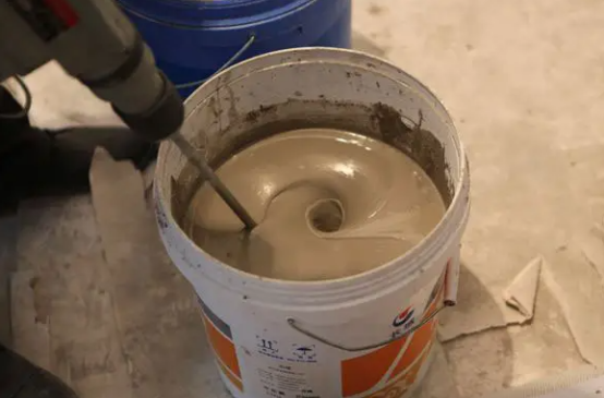 3、攪拌:用量水桶準(zhǔn)確稱量適量清水(加水量嚴(yán)格控制在23%~25%之間),倒入30L以上的攪拌桶,再將1包自流平粉全部倒入攪拌桶,用大功率電鉆(700w以上)配專用攪拌頭以低速進(jìn)行充分?jǐn)嚢柚辆鶆驘o結(jié)塊的稀糊狀即可(約 4~5min)。