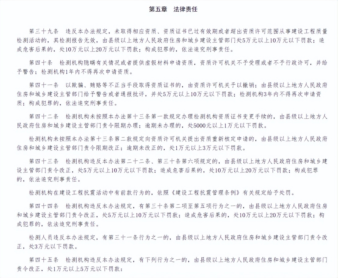規(guī)定:規(guī)定檢測機(jī)構(gòu)出具虛假檢測數(shù)據(jù)或者檢測報(bào)告的,由主管部門責(zé)令改正,處5萬元以上10萬元以下罰款;造成危害后果的,處10萬元以上20萬元以下罰款;構(gòu)成犯罪的,依法追究刑事責(zé)任。在建設(shè)工程抗震活動(dòng)中檢測機(jī)構(gòu)有相關(guān)行為的,要依照《建設(shè)工程抗震管理?xiàng)l例》有關(guān)規(guī)定給予處罰。